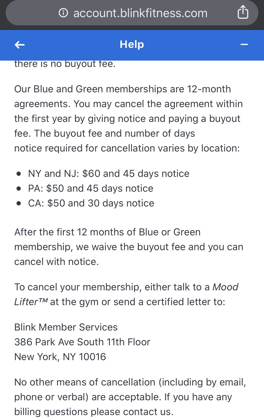 To save time Truebill can handle the subscription cancella. 50 buy-out fee and 30 days notice. Login to your Blink gym account on their website here.